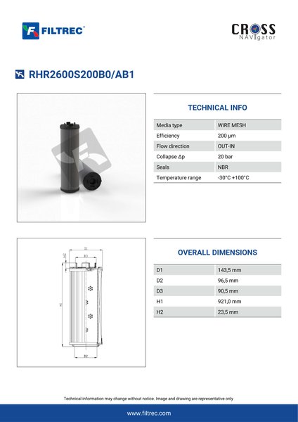 Filtrec RHR2600S200B0/AB1 Replaces the FilterFinder FF204638B