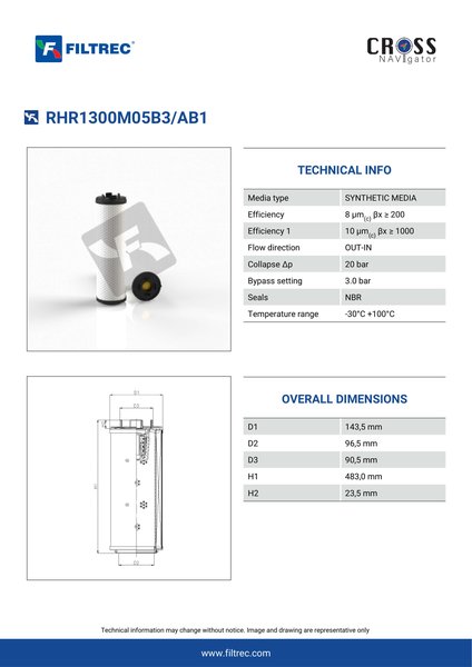 The efficiency of the element is shown using the Micron (µ) and Beta (β) ratings. The micron rating indicates the size of the particle being filtered and the beta rating the efficiency, calculated as 1/β.