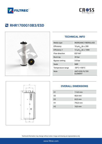 Filtrec RHR1700G10B3/ESD Replaces the FilterFinder FF205057B