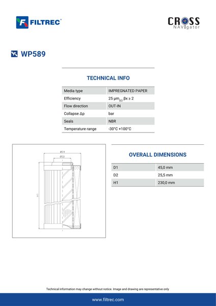 Genuine Filtrec WP589. This Filtrec element is designed to meet or exceed the quality and performance of brand OEM’s ensuring superior filtration performance and long-lasting durability.