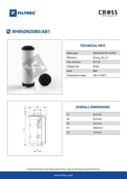 The efficiency of the element is shown using the Micron (µ) and Beta (β) ratings. The micron rating indicates the size of the particle being filtered and the beta rating the efficiency, calculated as 1/β.