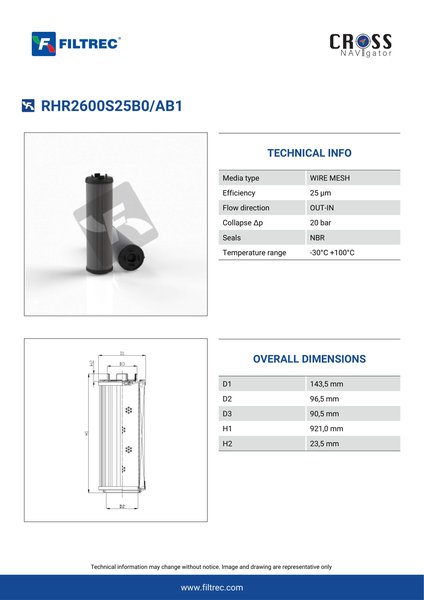 Genuine Filtrec RHR2600S25B0/AB1. This Filtrec element is designed to meet or exceed the quality and performance of brand OEM’s ensuring superior filtration performance and long-lasting durability.Engineered with their high performance media and a durable design, the RHR2600S25B0/AB1 provides reliable and consistent performance over its lifespan, even in harsh operating environments. When you order from FilterFinder, you can trust that you are getting a reliable and high-quality replacement filter that will keep your system running smoothly.