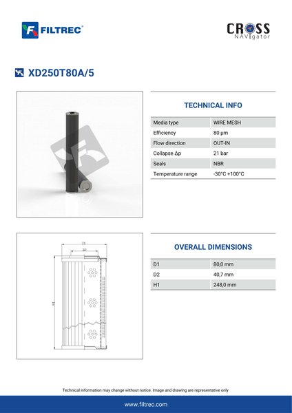 Genuine Filtrec XD250T80A/5. This Filtrec element is designed to meet or exceed the quality and performance of brand OEM’s ensuring superior filtration performance and long-lasting durability.