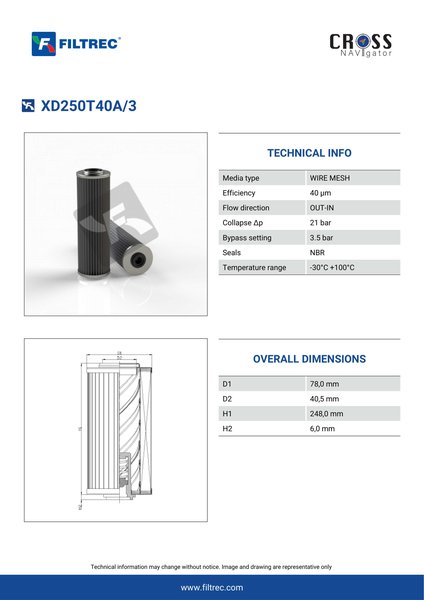 Genuine Filtrec XD250T40A/3. This Filtrec element is designed to meet or exceed the quality and performance of brand OEM’s ensuring superior filtration performance and long-lasting durability.