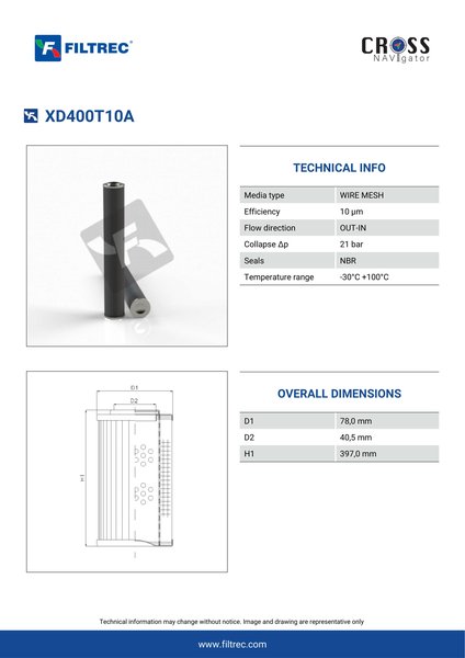 Genuine Filtrec XD400T10A. This Filtrec element is designed to meet or exceed the quality and performance of brand OEM’s ensuring superior filtration performance and long-lasting durability.