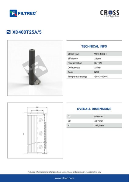 Genuine Filtrec XD400T25A/5. This Filtrec element is designed to meet or exceed the quality and performance of brand OEM’s ensuring superior filtration performance and long-lasting durability.