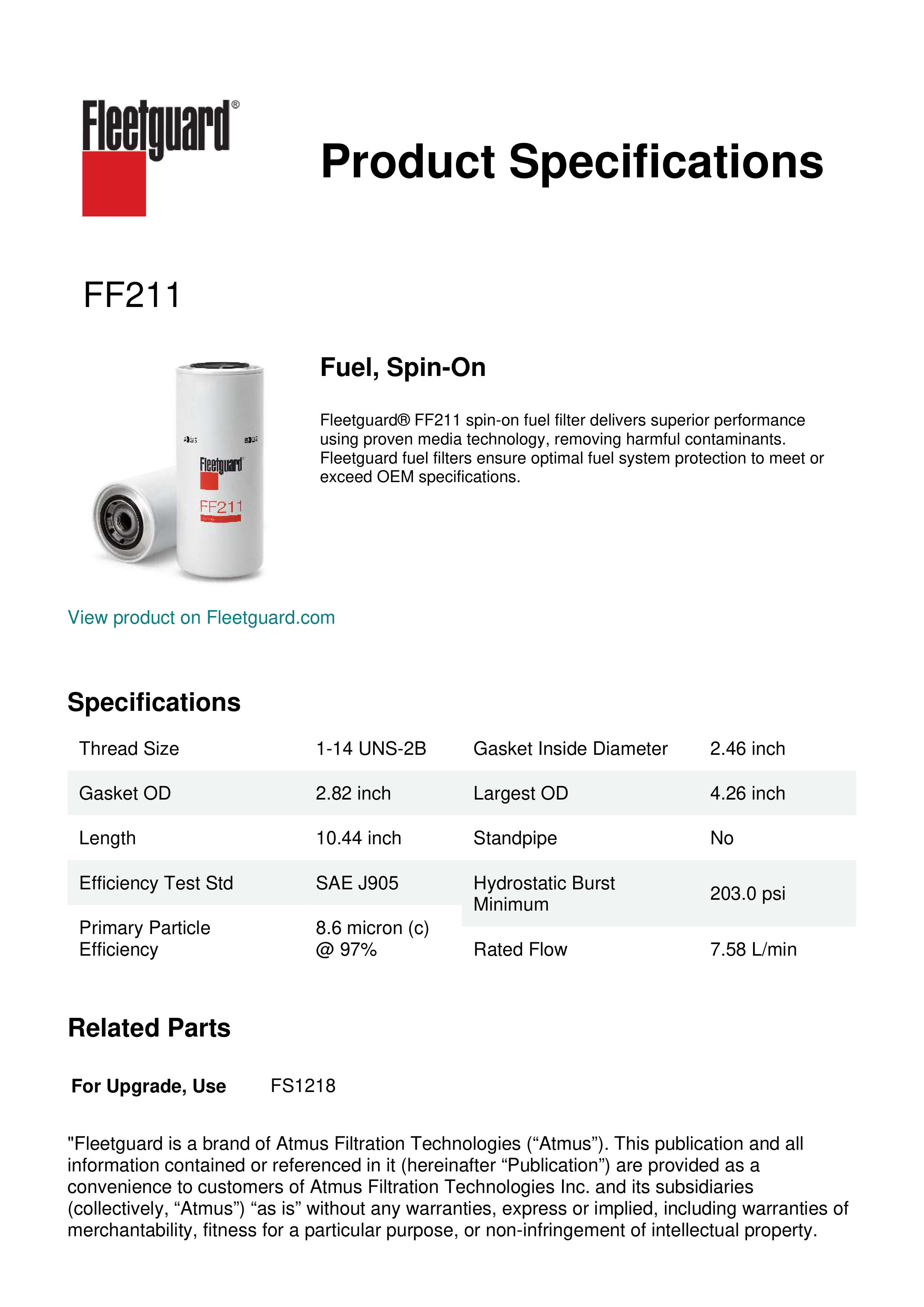 Fleetguard® FF211 spin-on fuel filter delivers superior performance using proven media technology, removing harmful contaminants. Fleetguard fuel filters ensure optimal fuel system protection to meet or exceed OEM specifications.Specification