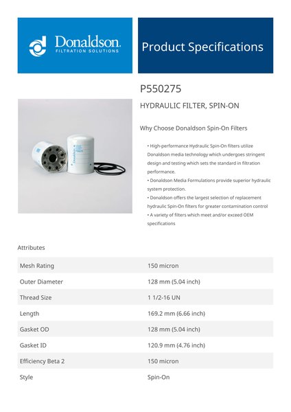 Donaldson P550275 Hydraulic Filter, Spin-On | Replaces the FilterFinder FF212637B