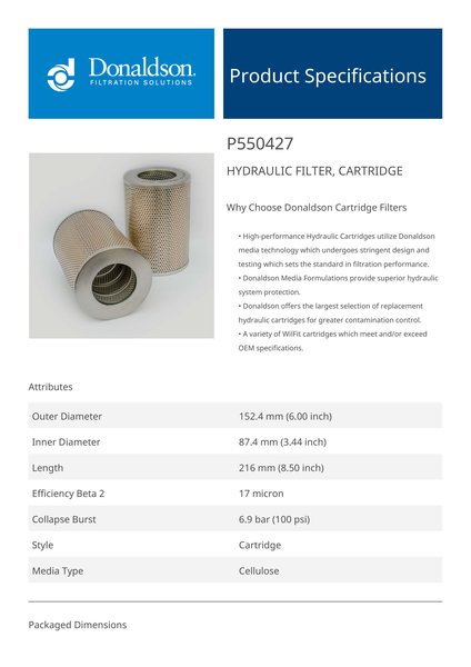 Genuine Donaldson P550427 Hydraulic Filter, Cartridge is designed to provide superior protection for your hydraulic system, effectively capturing contaminants to ensure clean fluid circulation. With high-quality filtration media, it extends equipment life, improves operational efficiency, and maintains fluid cleanliness even in the most demanding environments.