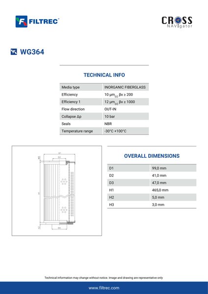 The efficiency of the element is shown using the Micron (µ) and Beta (β) ratings. The micron rating indicates the size of the particle being filtered and the beta rating the efficiency, calculated as 1/β.