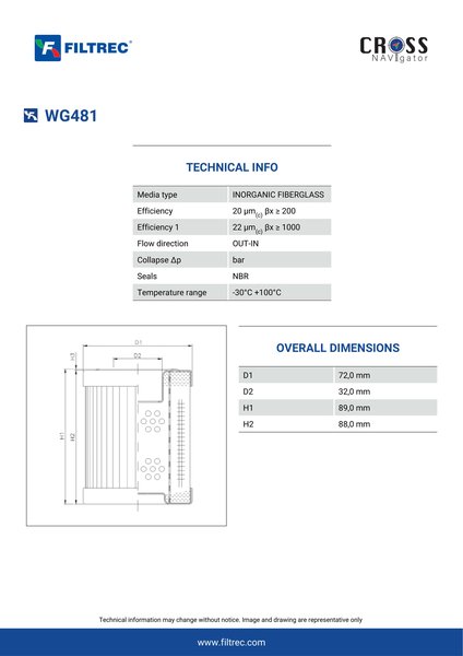 The efficiency of the element is shown using the Micron (µ) and Beta (β) ratings. The micron rating indicates the size of the particle being filtered and the beta rating the efficiency, calculated as 1/β.