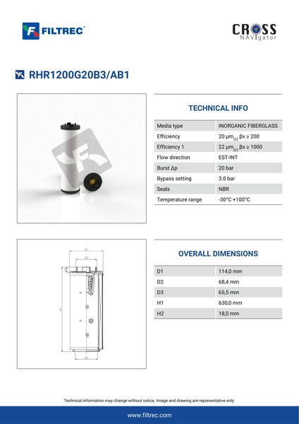 The efficiency of the element is shown using the Micron (µ) and Beta (β) ratings. The micron rating indicates the size of the particle being filtered and the beta rating the efficiency, calculated as 1/β.
