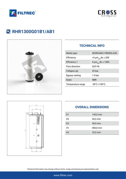 Engineered with their high performance media and a durable design, the RHR1300G01B1/AB1 provides reliable and consistent performance over its lifespan, even in harsh operating environments. When you order from FilterFinder, you can trust that you are getting a reliable and high-quality replacement filter that will keep your system running smoothly.