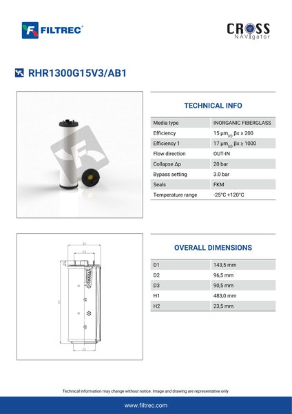 Genuine Filtrec RHR1300G15V3/AB1. This Filtrec element is designed to meet or exceed the quality and performance of brand OEM’s ensuring superior filtration performance and long-lasting durability.Engineered with their high performance media and a durable design, the RHR1300G15V3/AB1 provides reliable and consistent performance over its lifespan, even in harsh operating environments. When you order from FilterFinder, you can trust that you are getting a reliable and high-quality replacement filter that will keep your system running smoothly.