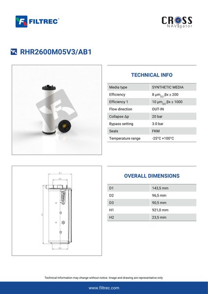 Genuine Filtrec RHR2600M05V3/AB1. This Filtrec element is designed to meet or exceed the quality and performance of brand OEM’s ensuring superior filtration performance and long-lasting durability.Engineered with their high performance media and a durable design, the RHR2600M05V3/AB1 provides reliable and consistent performance over its lifespan, even in harsh operating environments. When you order from FilterFinder, you can trust that you are getting a reliable and high-quality replacement filter that will keep your system running smoothly.