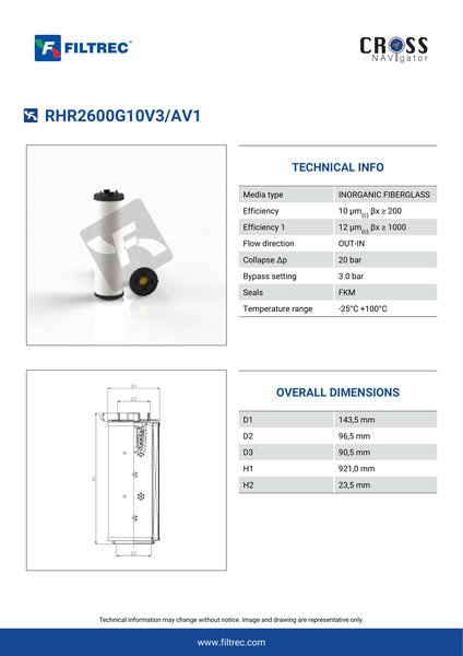 Genuine Filtrec RHR2600G10V3/AV1. This Filtrec element is designed to meet or exceed the quality and performance of brand OEM’s ensuring superior filtration performance and long-lasting durability.Engineered with their high performance media and a durable design, the RHR2600G10V3/AV1 provides reliable and consistent performance over its lifespan, even in harsh operating environments. When you order from FilterFinder, you can trust that you are getting a reliable and high-quality replacement filter that will keep your system running smoothly.