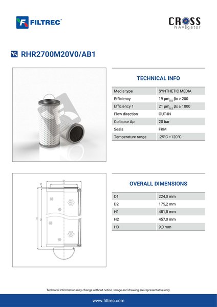 The efficiency of the element is shown using the Micron (µ) and Beta (β) ratings. The micron rating indicates the size of the particle being filtered and the beta rating the efficiency, calculated as 1/β.