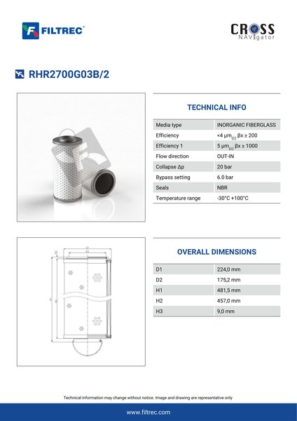 The efficiency of the element is shown using the Micron (µ) and Beta (β) ratings. The micron rating indicates the size of the particle being filtered and the beta rating the efficiency, calculated as 1/β.