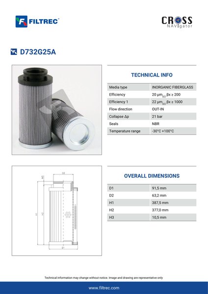 Engineered with their high performance media and a durable design, the D732G25A provides reliable and consistent performance over its lifespan, even in harsh operating environments. When you order from FilterFinder, you can trust that you are getting a reliable and high-quality replacement filter that will keep your system running smoothly.