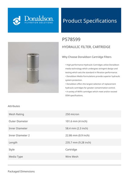Genuine Donaldson P578599 Hydraulic Filter, Cartridge is designed to provide superior protection for your hydraulic system, effectively capturing contaminants to ensure clean fluid circulation. With high-quality filtration media, it extends equipment life, improves operational efficiency, and maintains fluid cleanliness even in the most demanding environments.