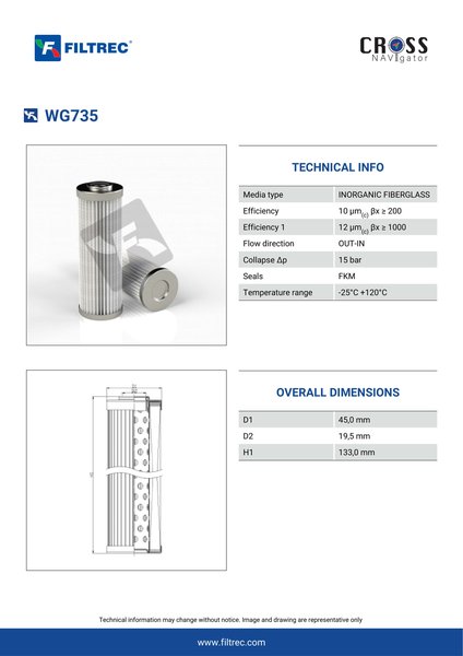 The efficiency of the element is shown using the Micron (µ) and Beta (β) ratings. The micron rating indicates the size of the particle being filtered and the beta rating the efficiency, calculated as 1/β.
