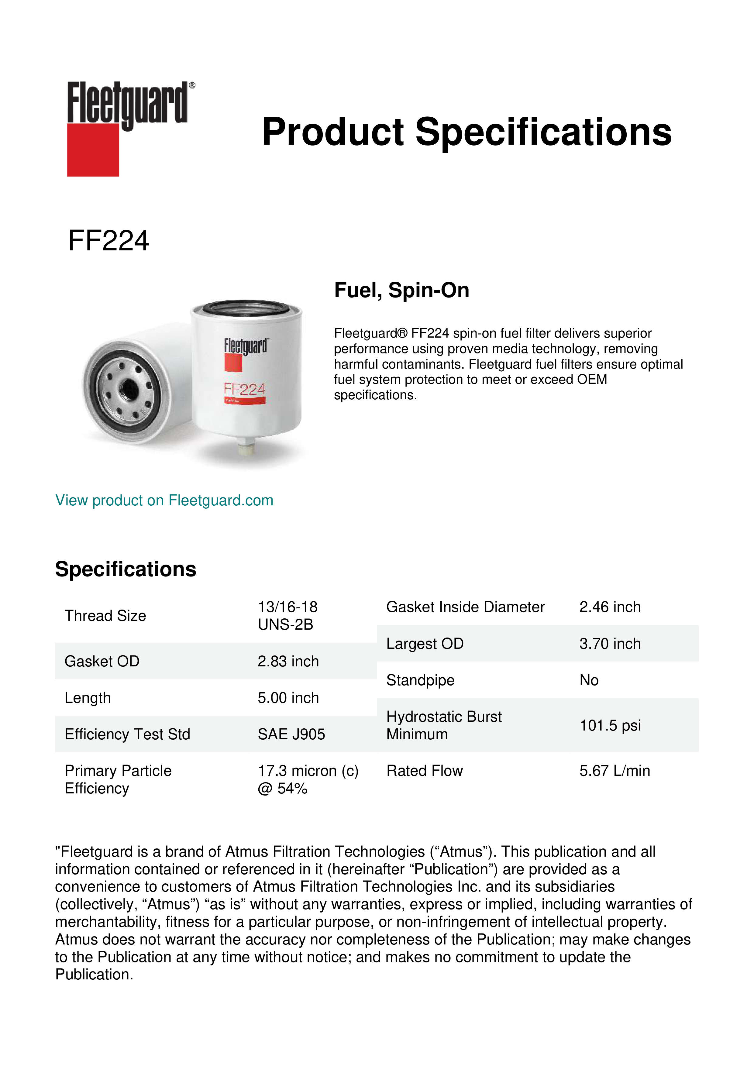 Fleetguard® FF224 spin-on fuel filter delivers superior performance using proven media technology, removing harmful contaminants. Fleetguard fuel filters ensure optimal fuel system protection to meet or exceed OEM specifications.Specification