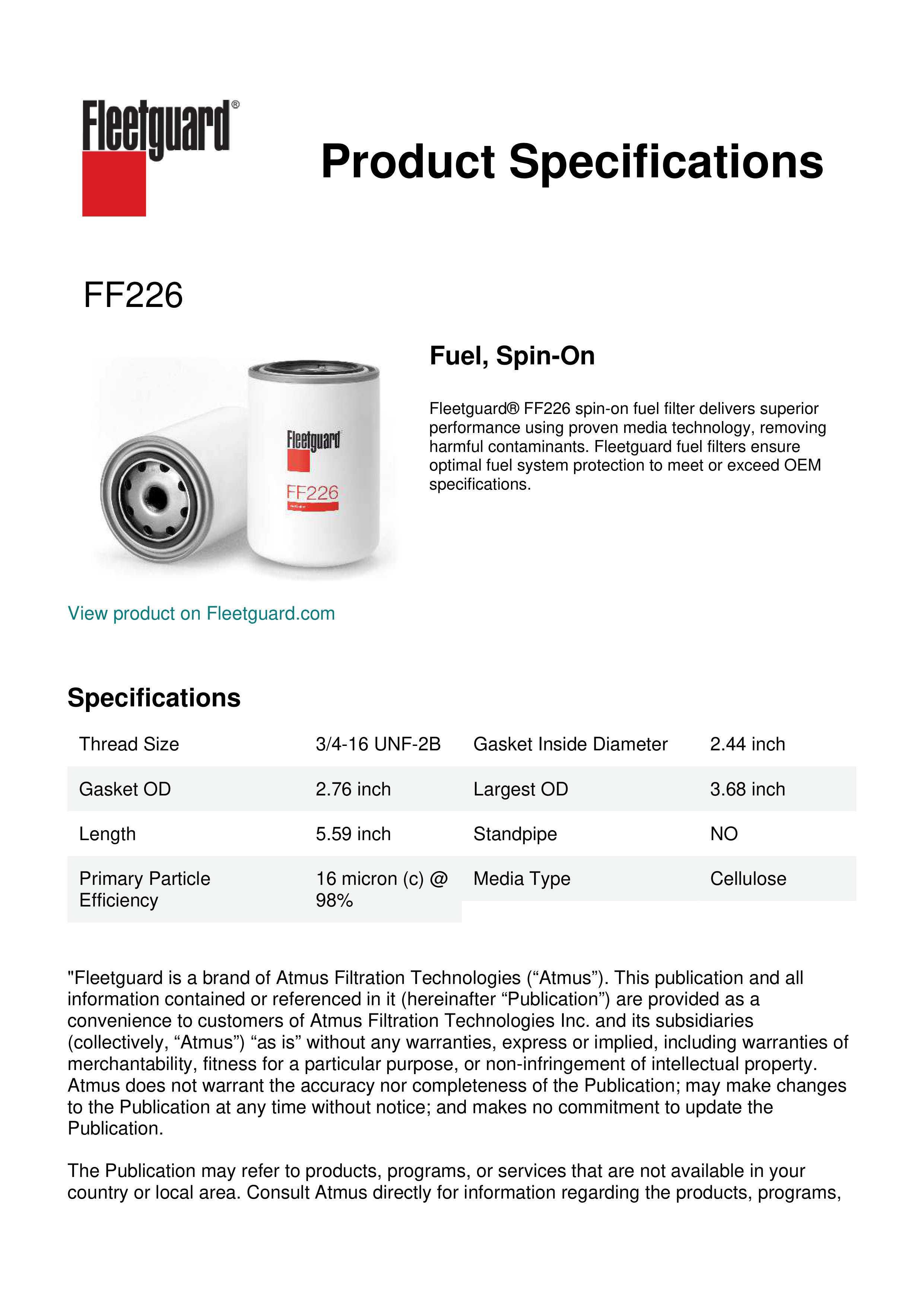Fleetguard® FF226 spin-on fuel filter delivers superior performance using proven media technology, removing harmful contaminants. Fleetguard fuel filters ensure optimal fuel system protection to meet or exceed OEM specifications.Specification