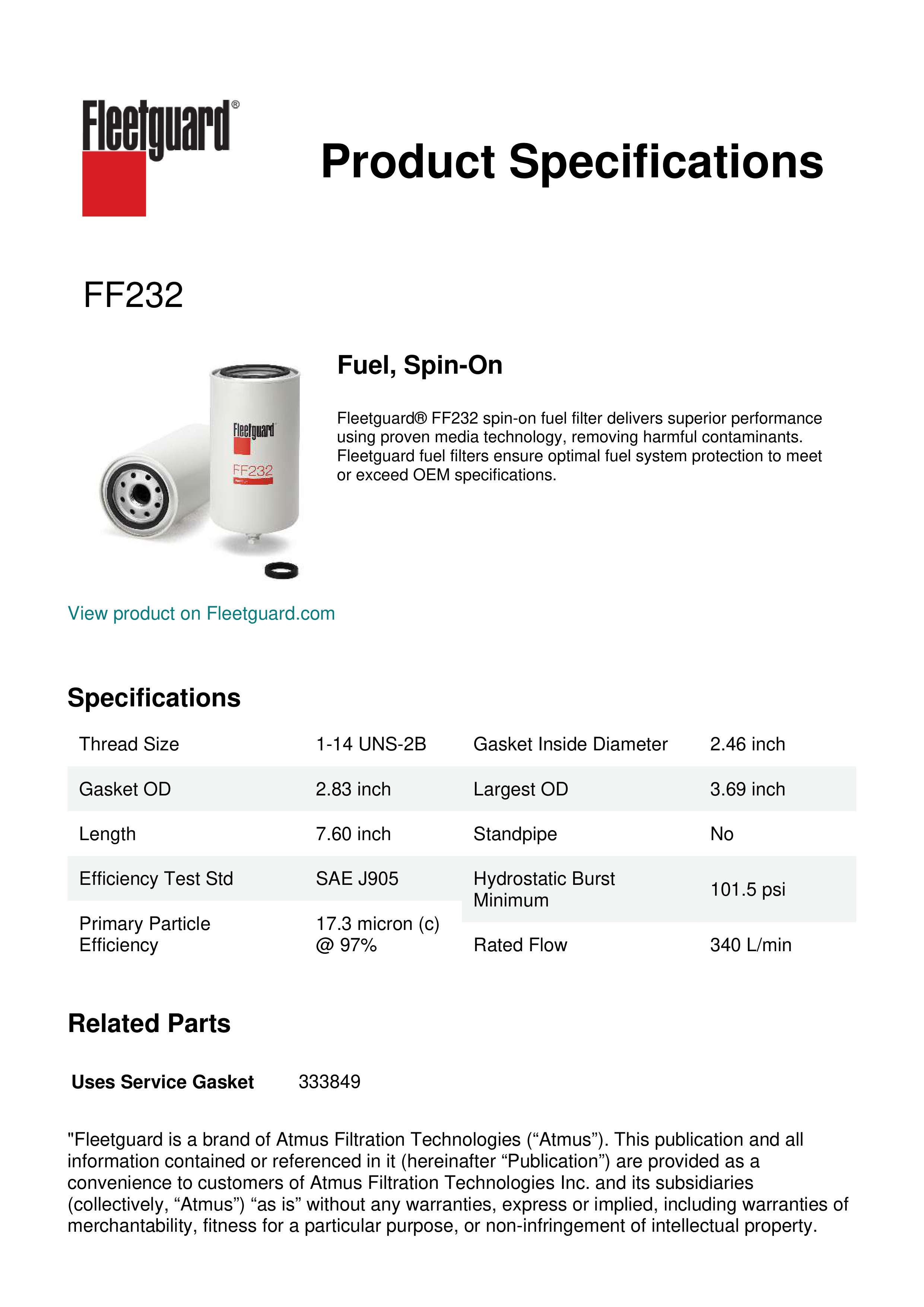 Fleetguard® FF232 spin-on fuel filter delivers superior performance using proven media technology, removing harmful contaminants. Fleetguard fuel filters ensure optimal fuel system protection to meet or exceed OEM specifications.Specification
