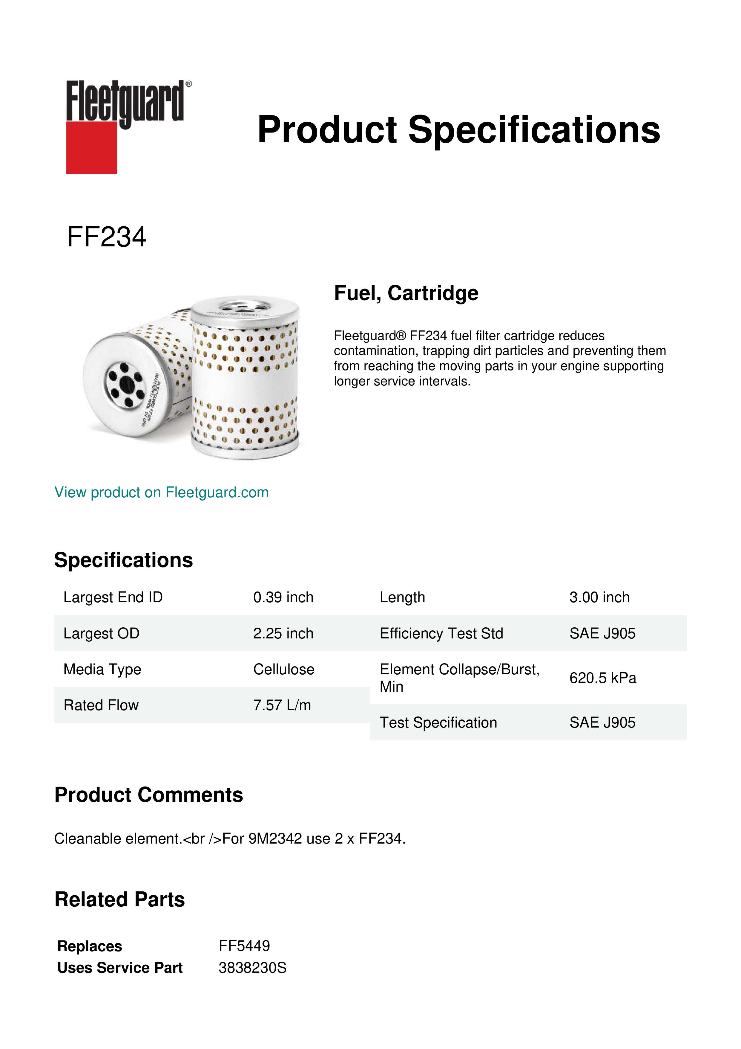 Fleetguard® FF234 fuel filter cartridge reduces contamination, trapping dirt particles and preventing them from reaching the moving parts in your engine supporting longer service intervals.Specification
