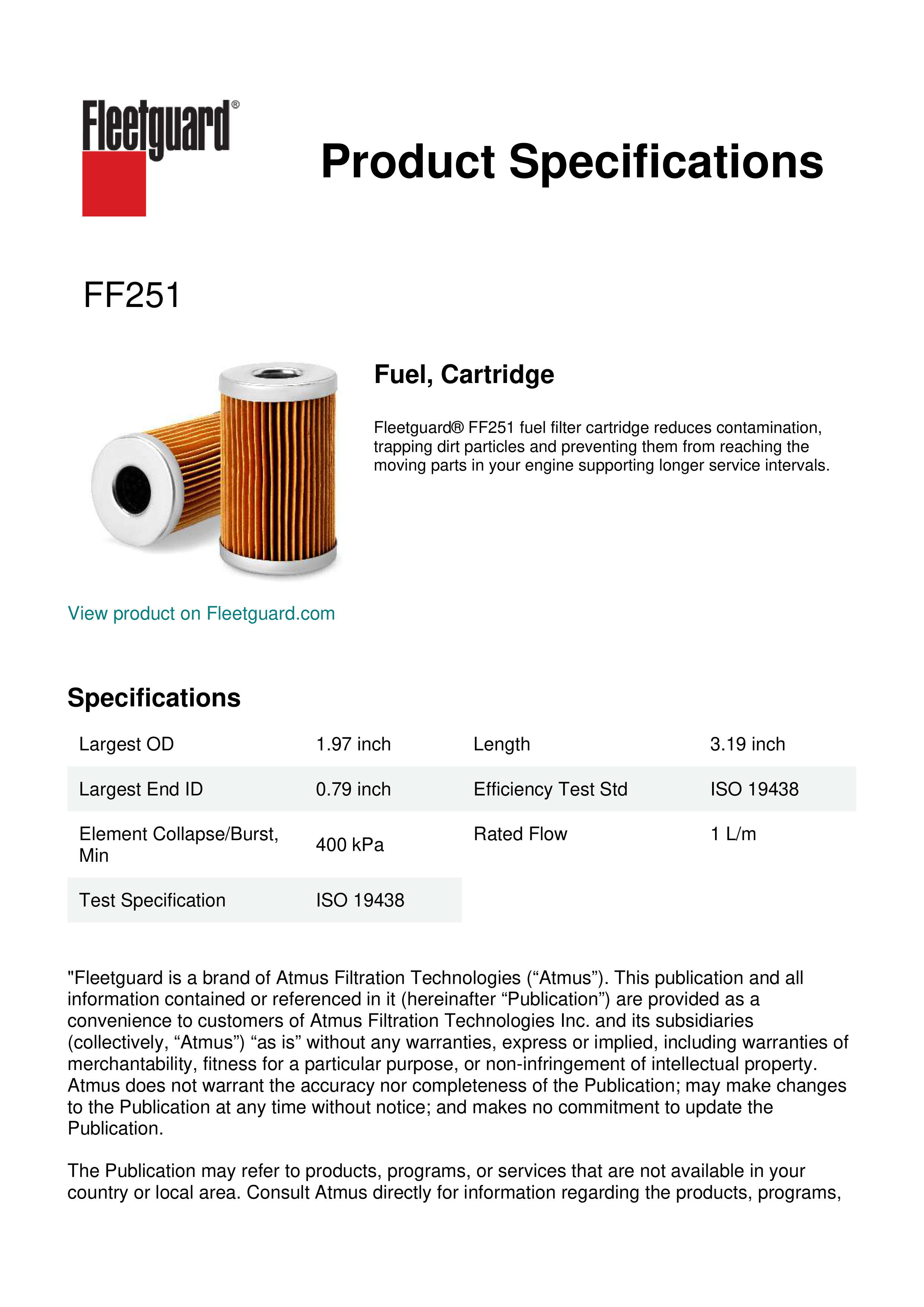 Fleetguard® FF251 fuel filter cartridge reduces contamination, trapping dirt particles and preventing them from reaching the moving parts in your engine supporting longer service intervals.Specification