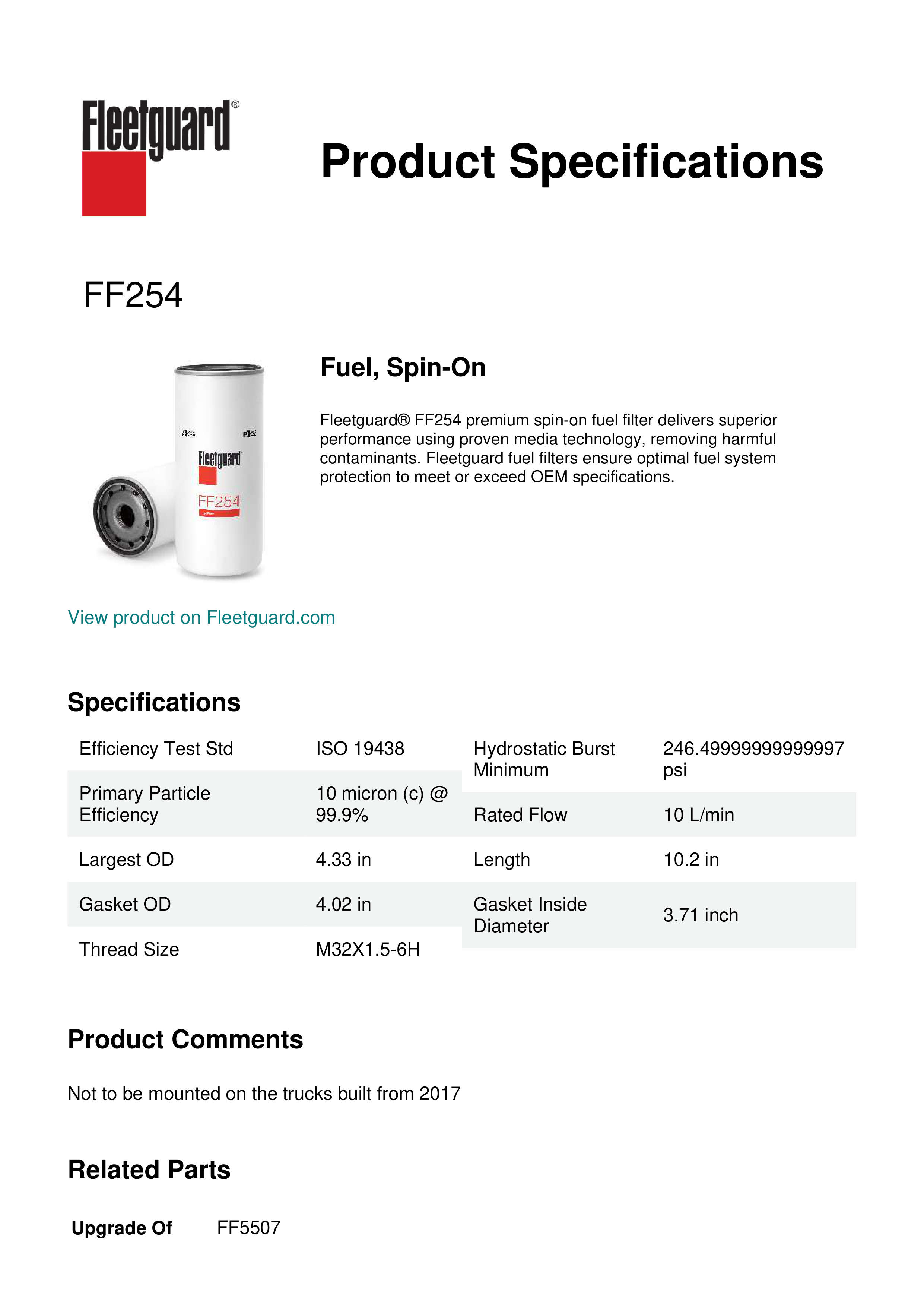 Fleetguard® FF254 premium spin-on fuel filter delivers superior performance using proven media technology, removing harmful contaminants. Fleetguard fuel filters ensure optimal fuel system protection to meet or exceed OEM specifications.Specification