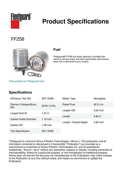 Fleetguard® FF258 fuel water separator cartridge filter works to remove water and other particulates and ensures clean fuel is delivered to your engine.Specification