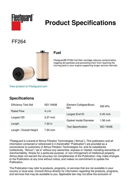 Fleetguard® FF264 fuel filter cartridge reduces contamination, trapping dirt particles and preventing them from reaching the moving parts in your engine supporting longer service intervals.Specification