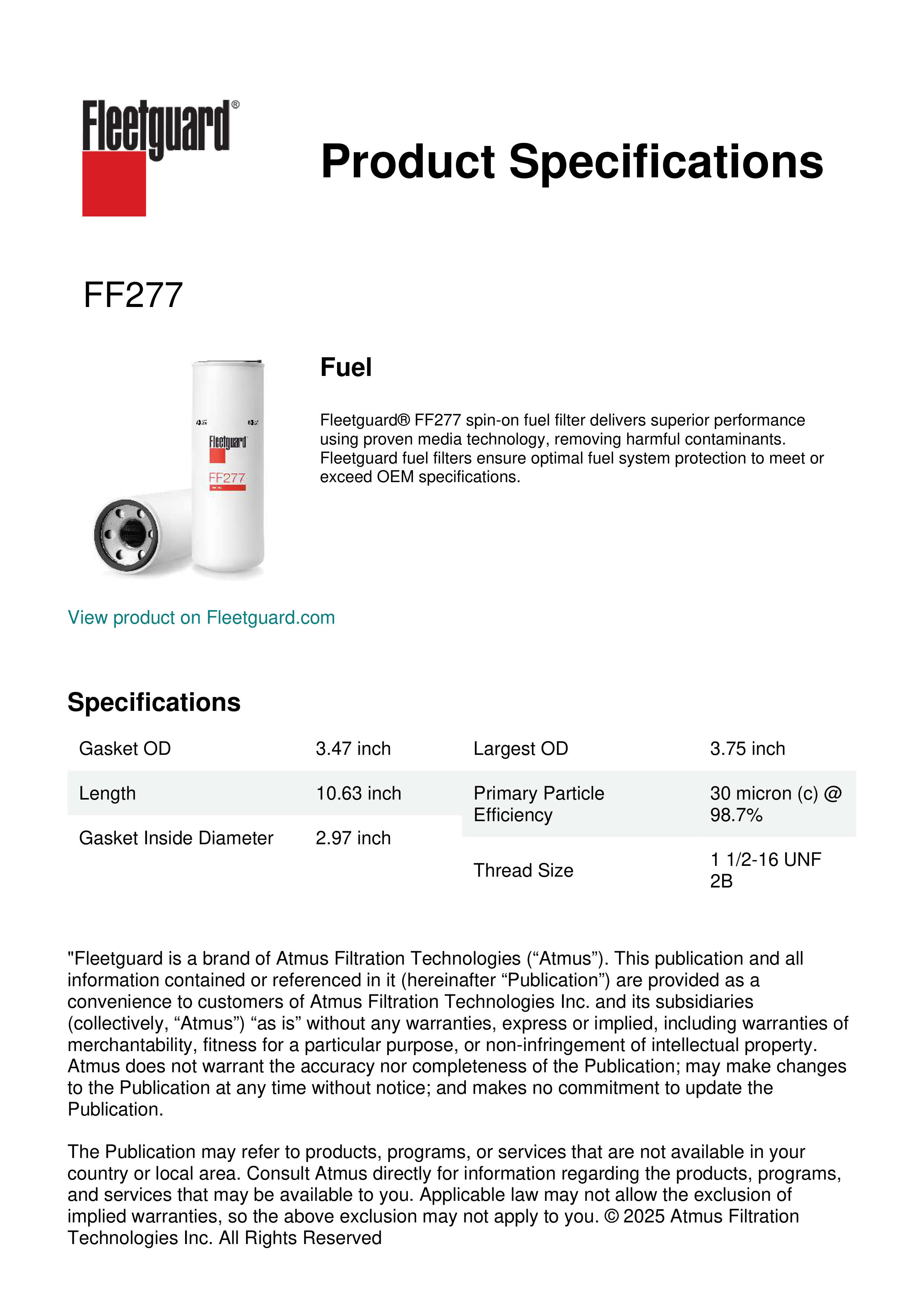 Fleetguard® FF277 spin-on fuel filter delivers superior performance using proven media technology, removing harmful contaminants. Fleetguard fuel filters ensure optimal fuel system protection to meet or exceed OEM specifications.Specification