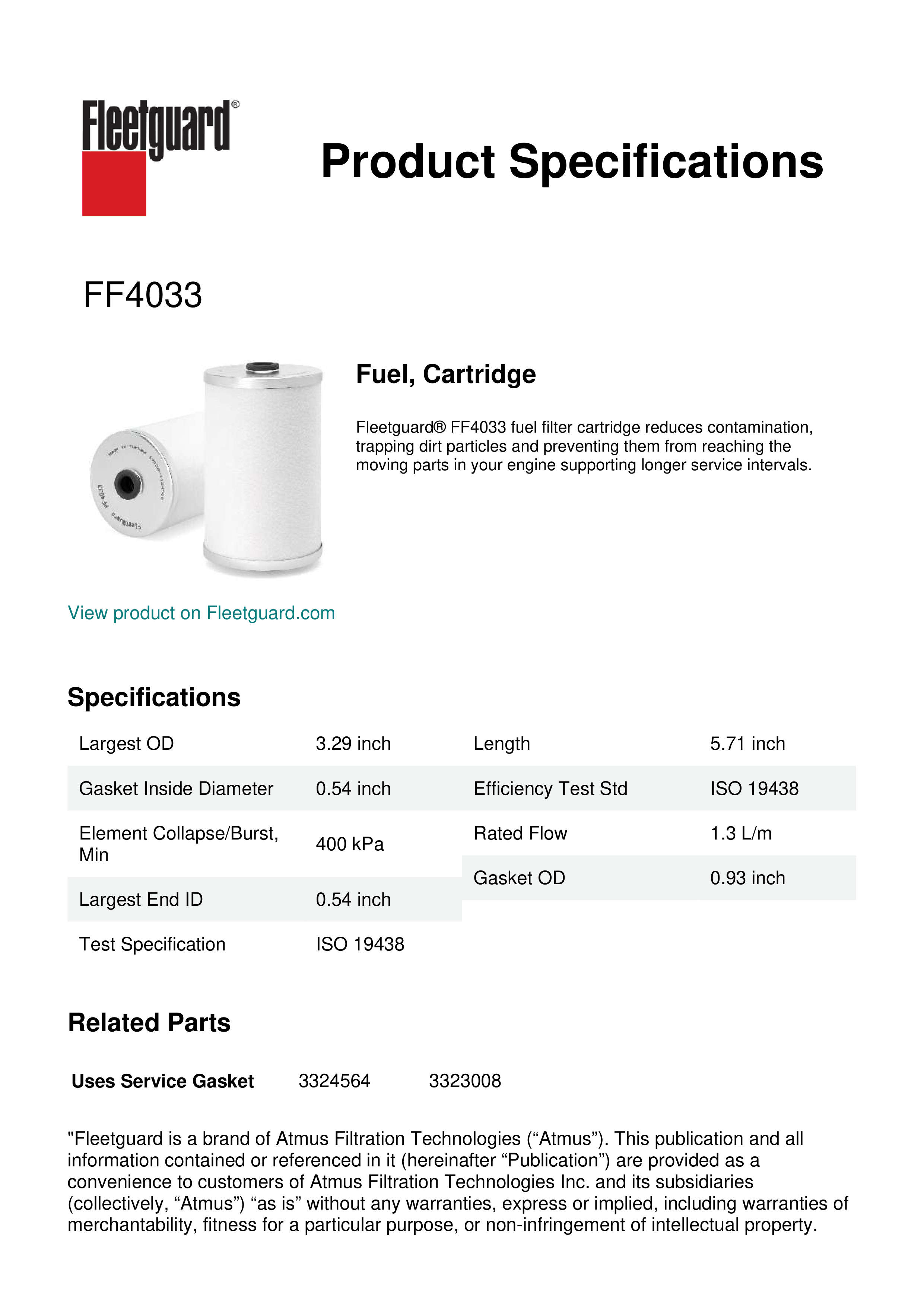 Fleetguard® FF4033 fuel filter cartridge reduces contamination, trapping dirt particles and preventing them from reaching the moving parts in your engine supporting longer service intervals.Specification