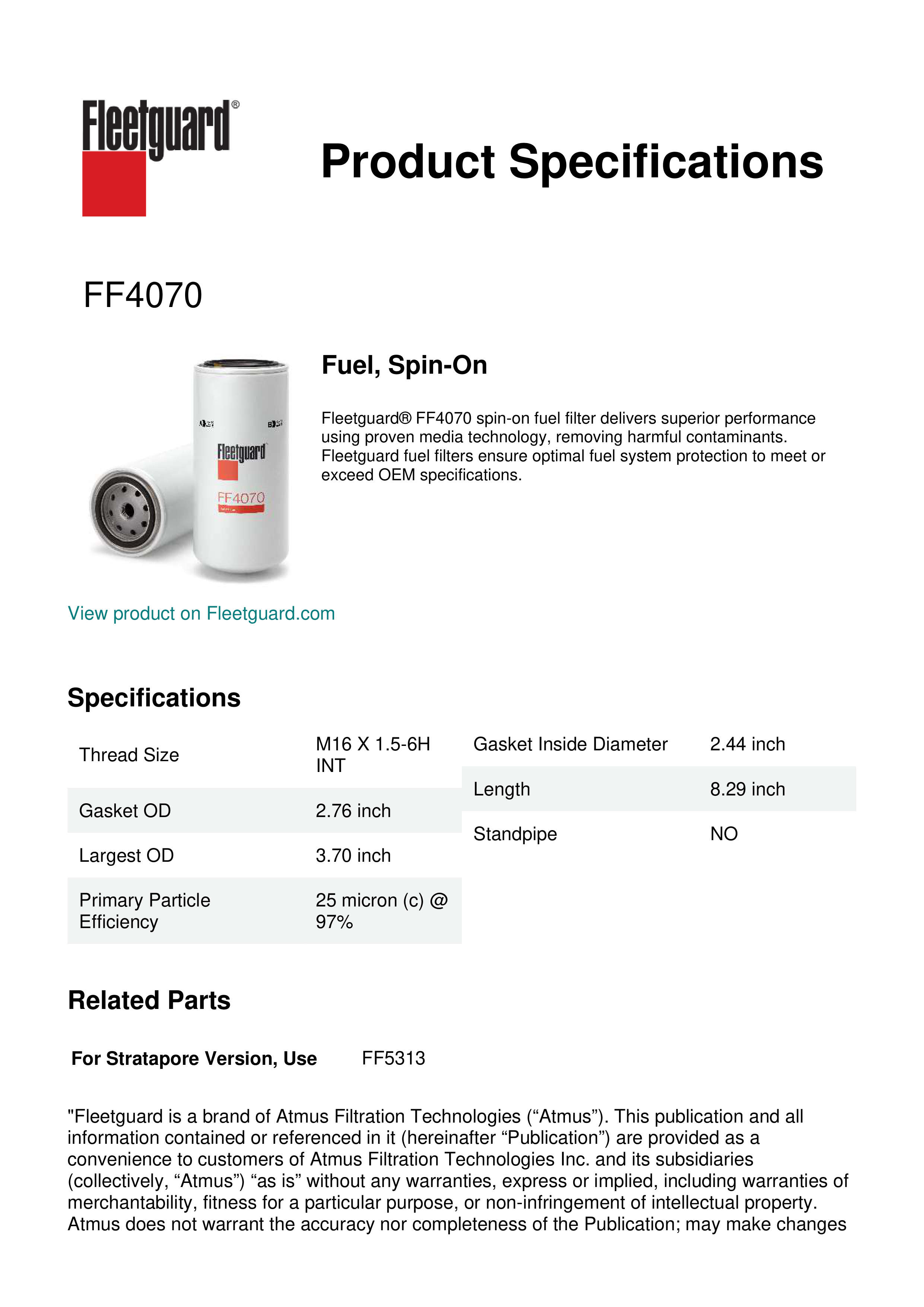 Fleetguard® FF4070 spin-on fuel filter delivers superior performance using proven media technology, removing harmful contaminants. Fleetguard fuel filters ensure optimal fuel system protection to meet or exceed OEM specifications.Specification