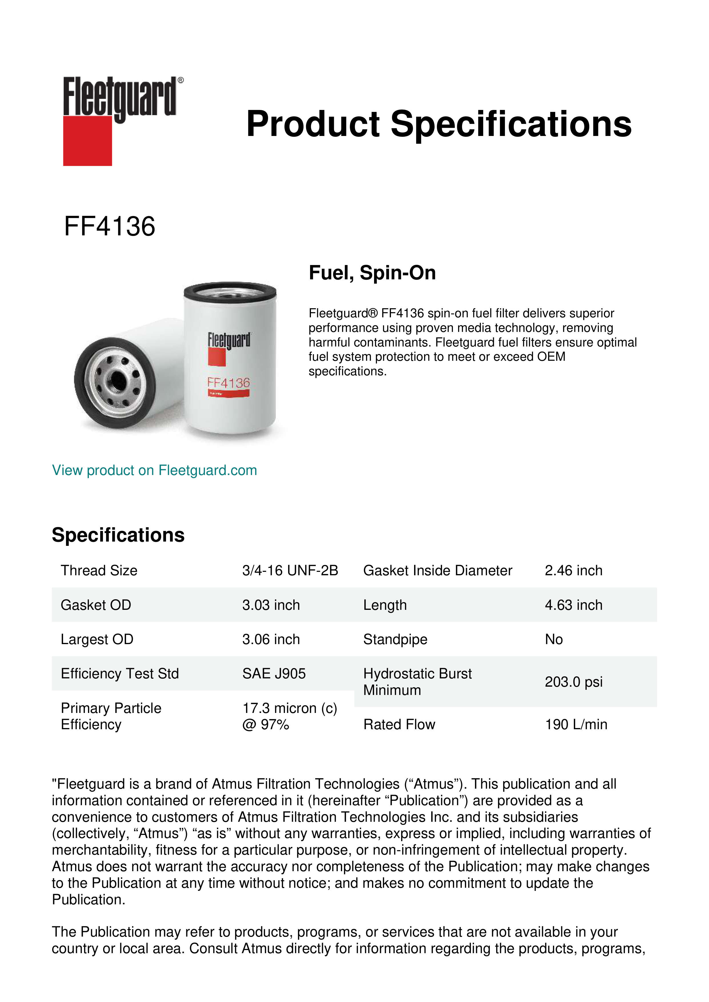 Fleetguard® FF4136 spin-on fuel filter delivers superior performance using proven media technology, removing harmful contaminants. Fleetguard fuel filters ensure optimal fuel system protection to meet or exceed OEM specifications.Specification