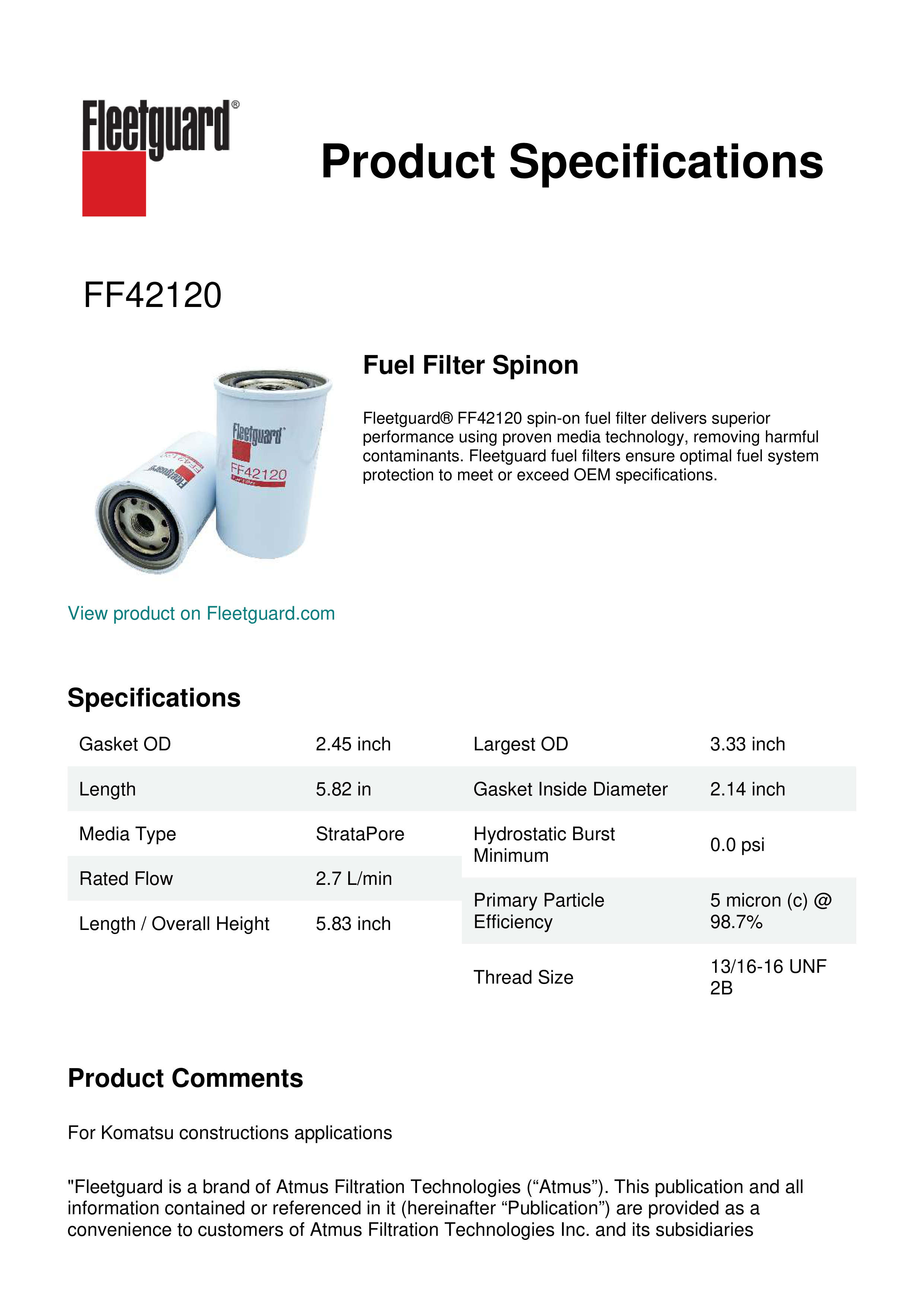 Fleetguard® FF42120 spin-on fuel filter delivers superior performance using proven media technology, removing harmful contaminants. Fleetguard fuel filters ensure optimal fuel system protection to meet or exceed OEM specifications.Specification
