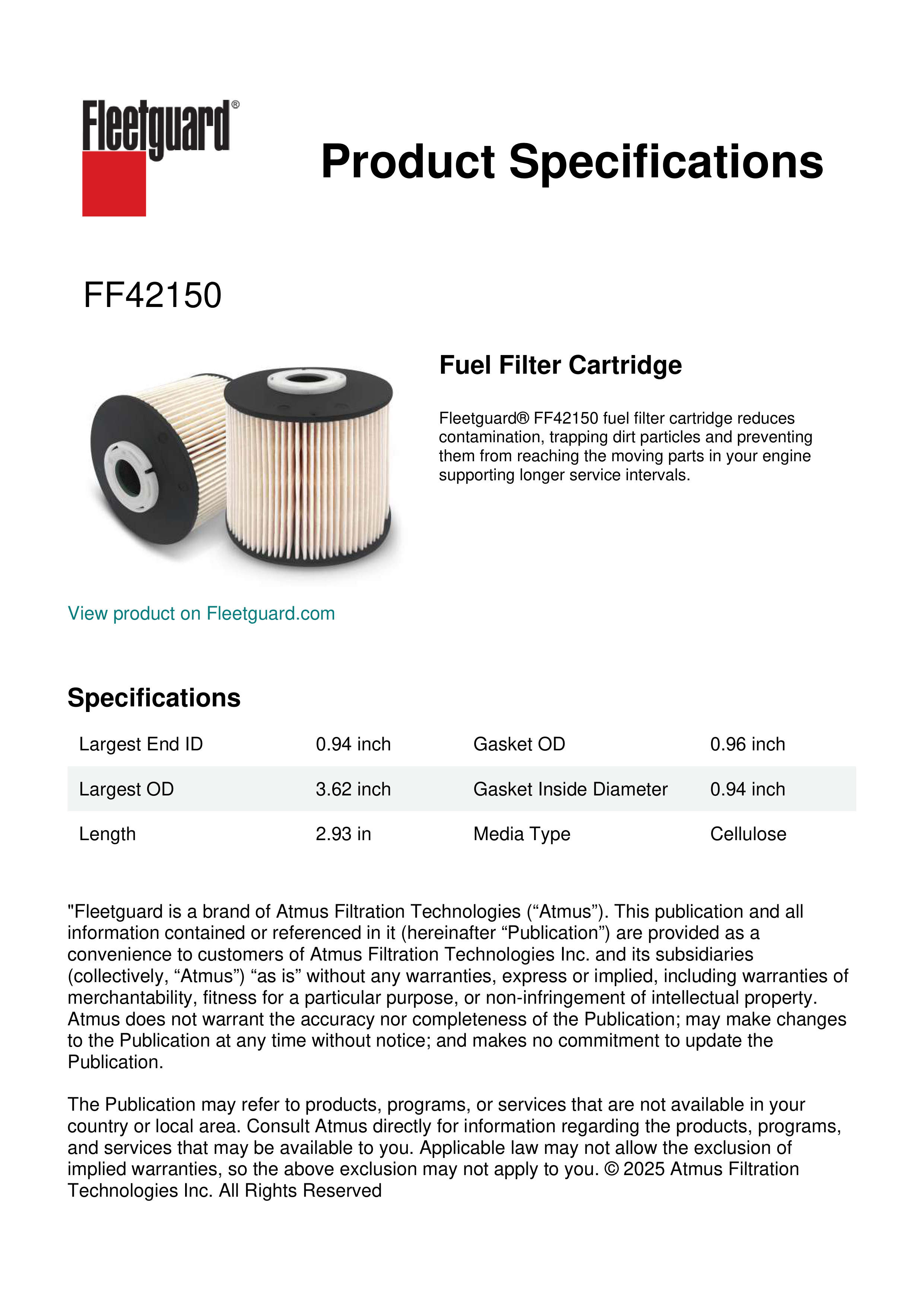 Fleetguard® FF42150 fuel filter cartridge reduces contamination, trapping dirt particles and preventing them from reaching the moving parts in your engine supporting longer service intervals.Specification