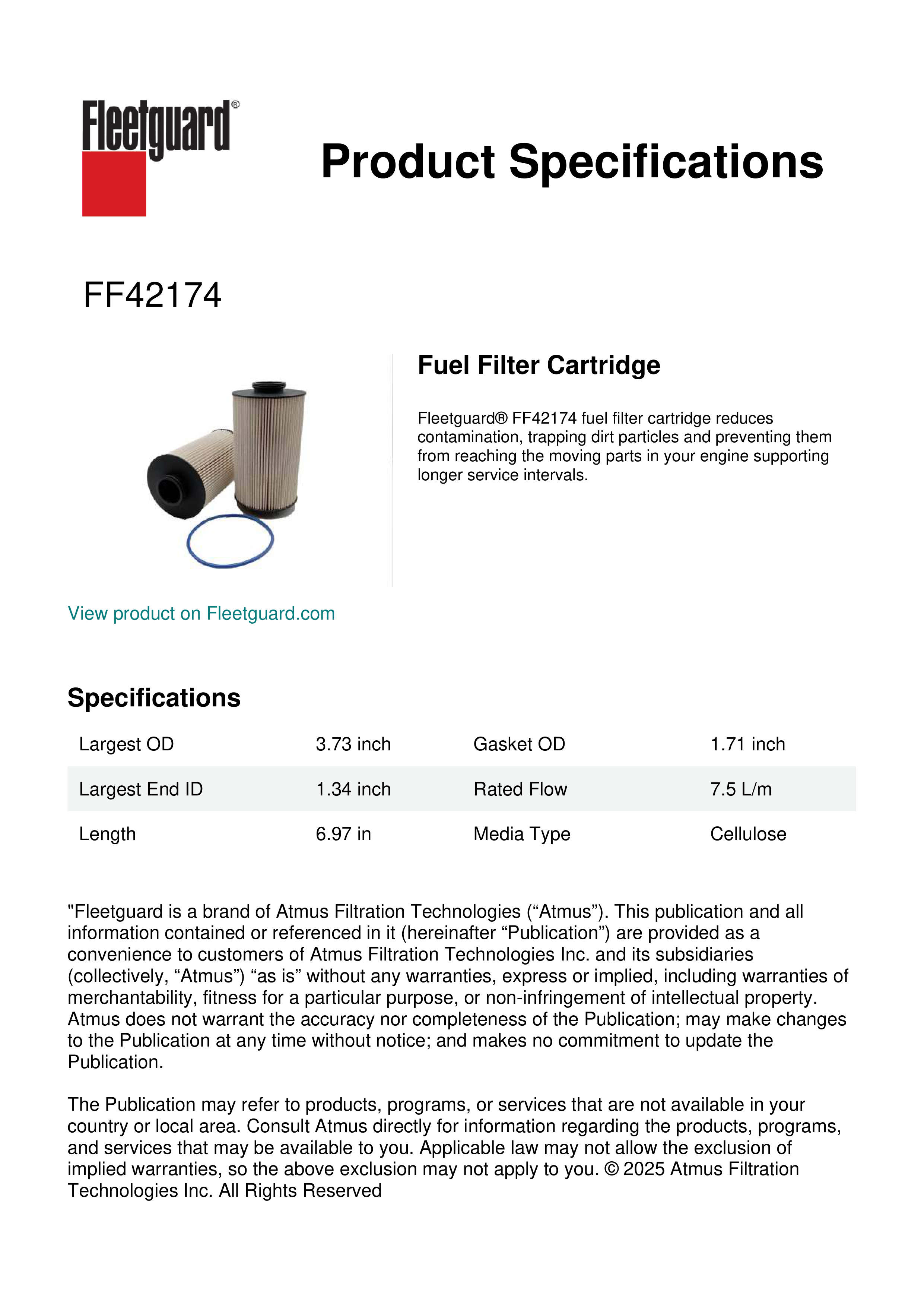 Fleetguard® FF42174 fuel filter cartridge reduces contamination, trapping dirt particles and preventing them from reaching the moving parts in your engine supporting longer service intervals.Specification