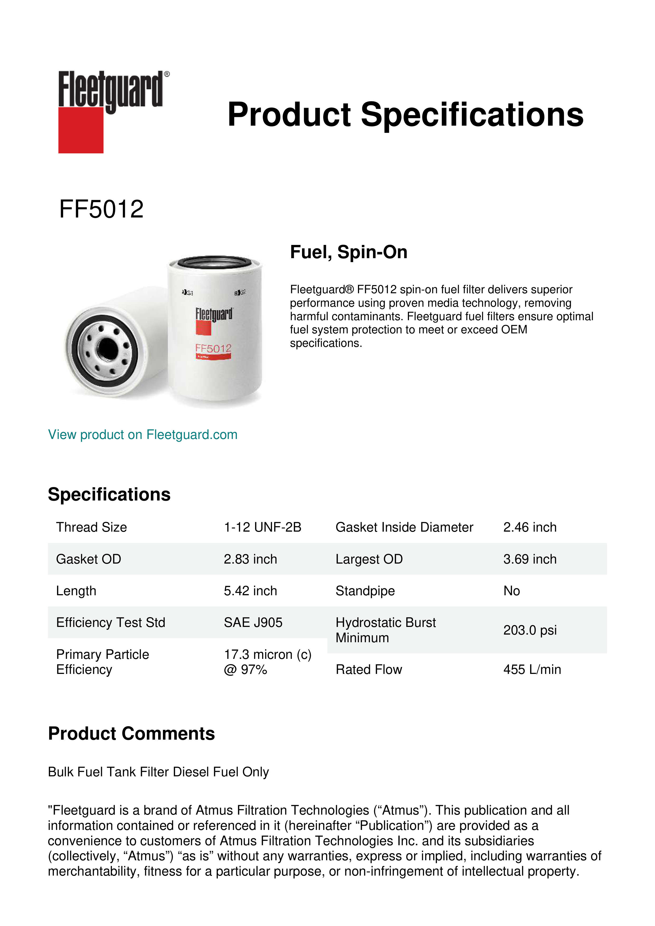 Fleetguard® FF5012 spin-on fuel filter delivers superior performance using proven media technology, removing harmful contaminants. Fleetguard fuel filters ensure optimal fuel system protection to meet or exceed OEM specifications.Specification