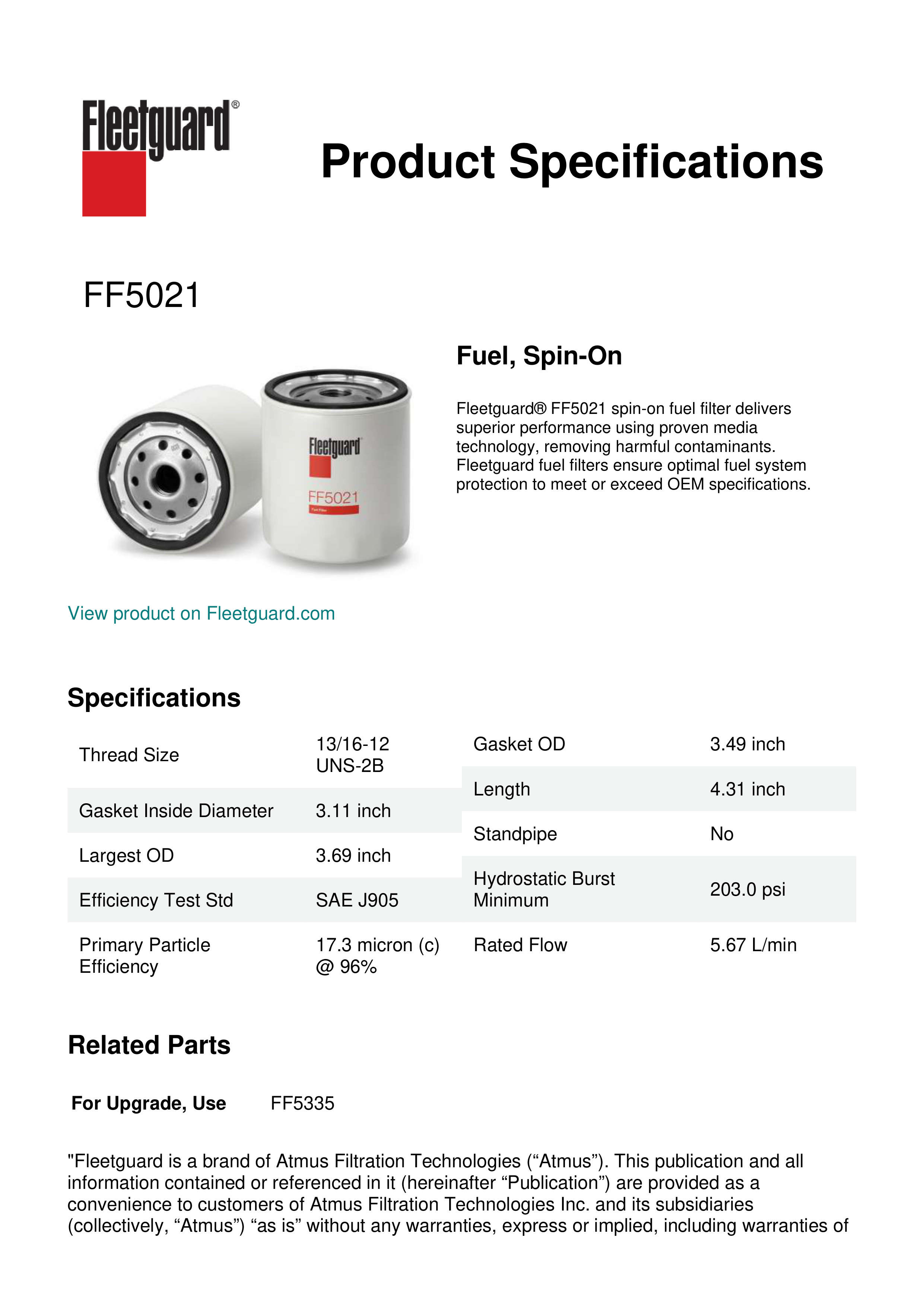 Fleetguard® FF5021 spin-on fuel filter delivers superior performance using proven media technology, removing harmful contaminants. Fleetguard fuel filters ensure optimal fuel system protection to meet or exceed OEM specifications.Specification