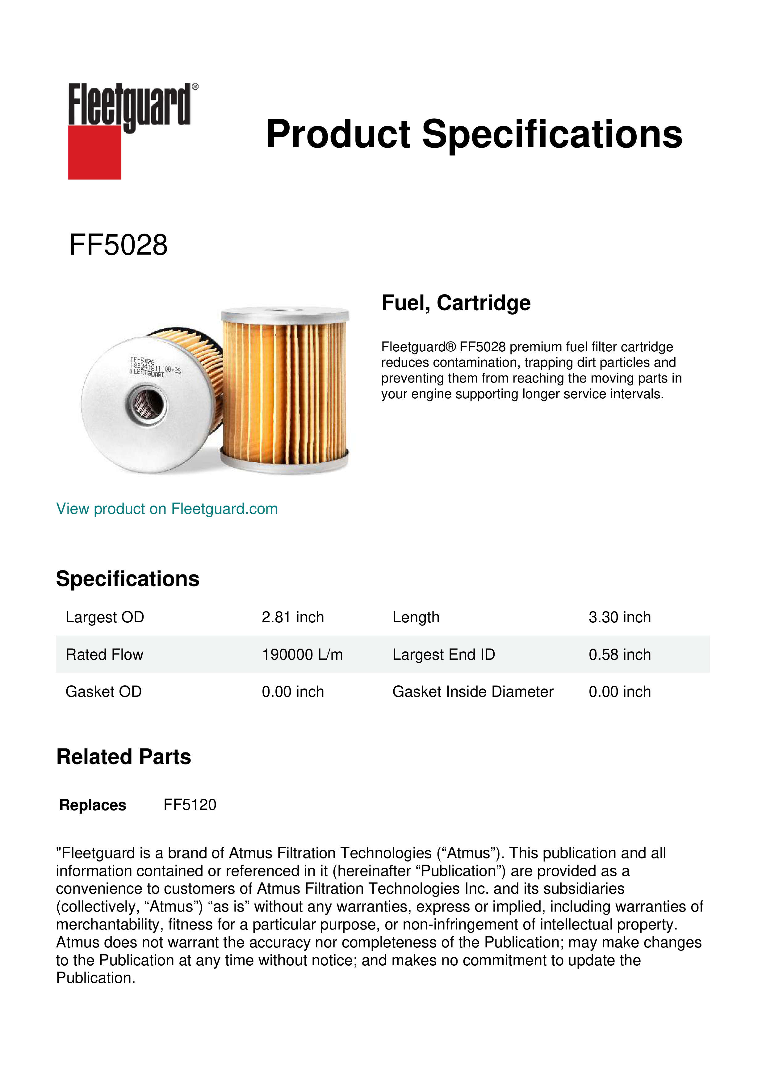 Fleetguard® FF5028 premium fuel filter cartridge reduces contamination, trapping dirt particles and preventing them from reaching the moving parts in your engine supporting longer service intervals.Specification