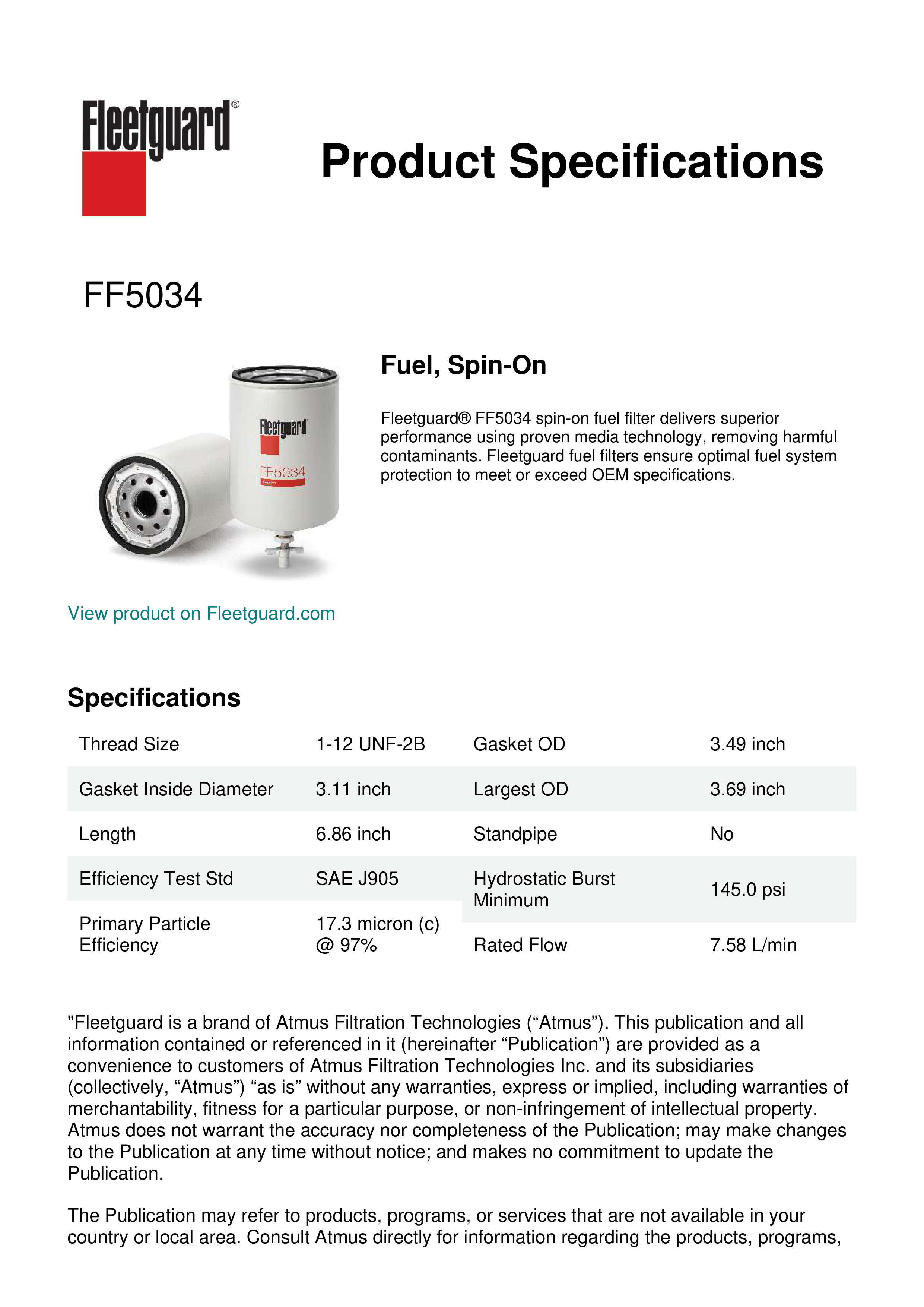 Fleetguard® FF5034 spin-on fuel filter delivers superior performance using proven media technology, removing harmful contaminants. Fleetguard fuel filters ensure optimal fuel system protection to meet or exceed OEM specifications.Specification