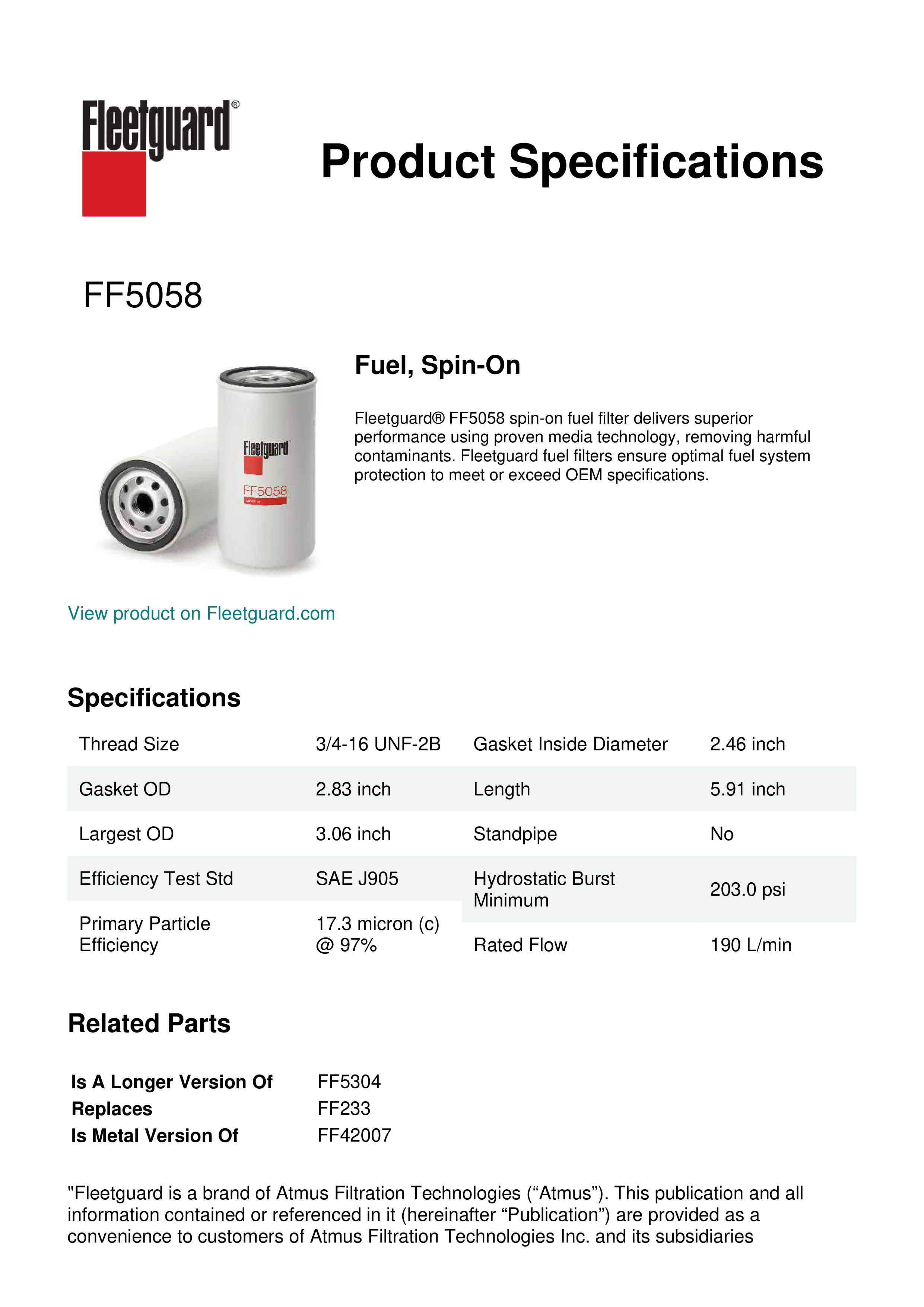 Fleetguard® FF5058 spin-on fuel filter delivers superior performance using proven media technology, removing harmful contaminants. Fleetguard fuel filters ensure optimal fuel system protection to meet or exceed OEM specifications.Specification