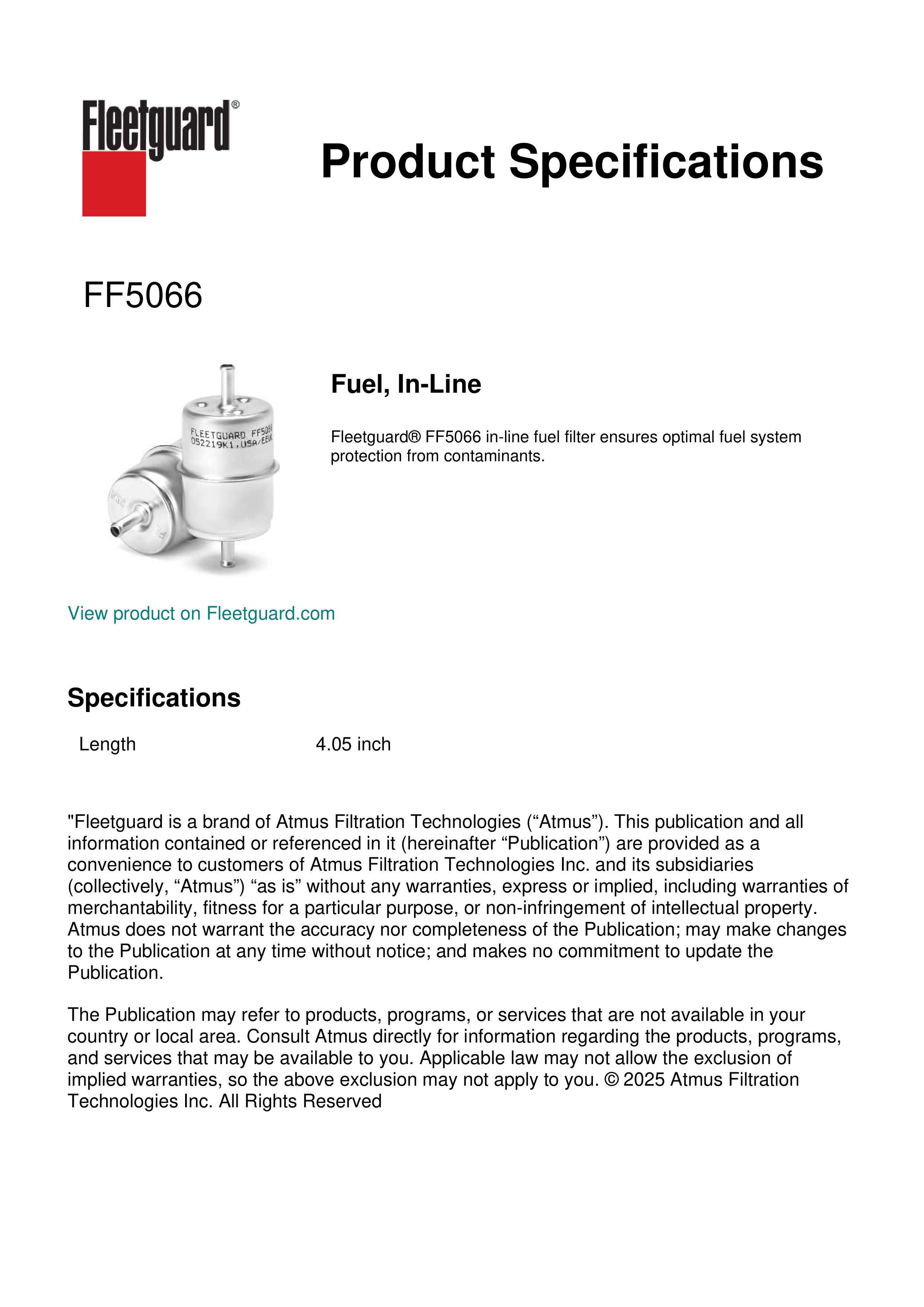 Fleetguard® FF5066 in-line fuel filter ensures optimal fuel system protection from contaminants.Specification