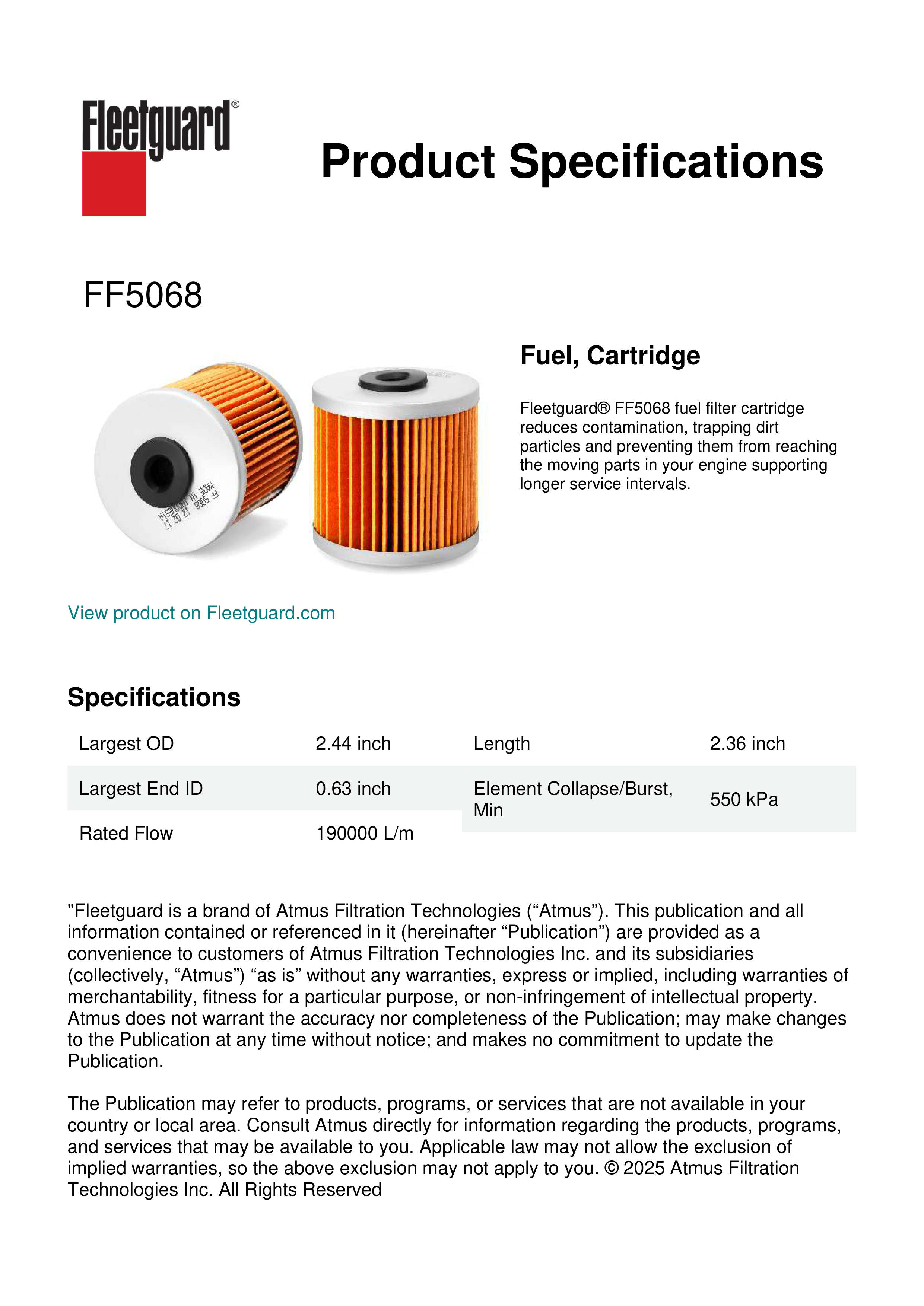 Fleetguard® FF5068 fuel filter cartridge reduces contamination, trapping dirt particles and preventing them from reaching the moving parts in your engine supporting longer service intervals.Specification