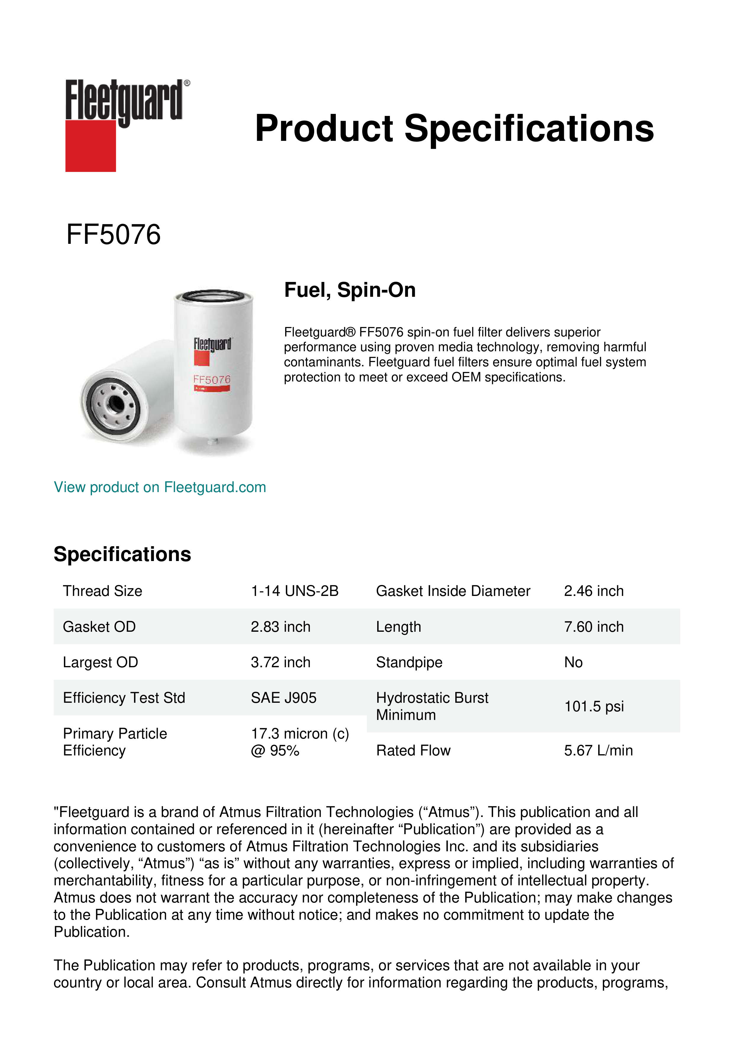 Fleetguard® FF5076 spin-on fuel filter delivers superior performance using proven media technology, removing harmful contaminants. Fleetguard fuel filters ensure optimal fuel system protection to meet or exceed OEM specifications.Specification