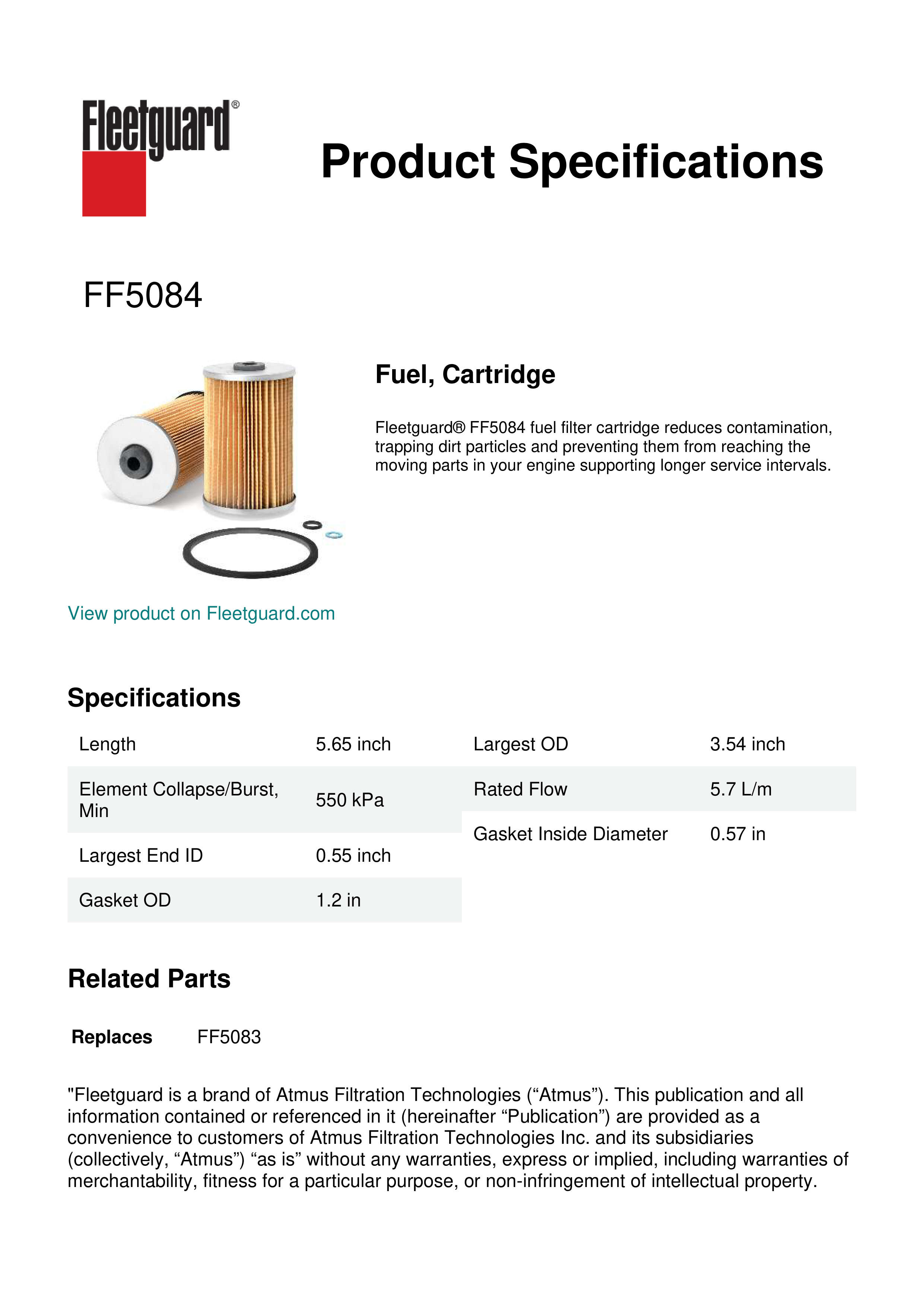 Fleetguard® FF5084 fuel filter cartridge reduces contamination, trapping dirt particles and preventing them from reaching the moving parts in your engine supporting longer service intervals.Specification