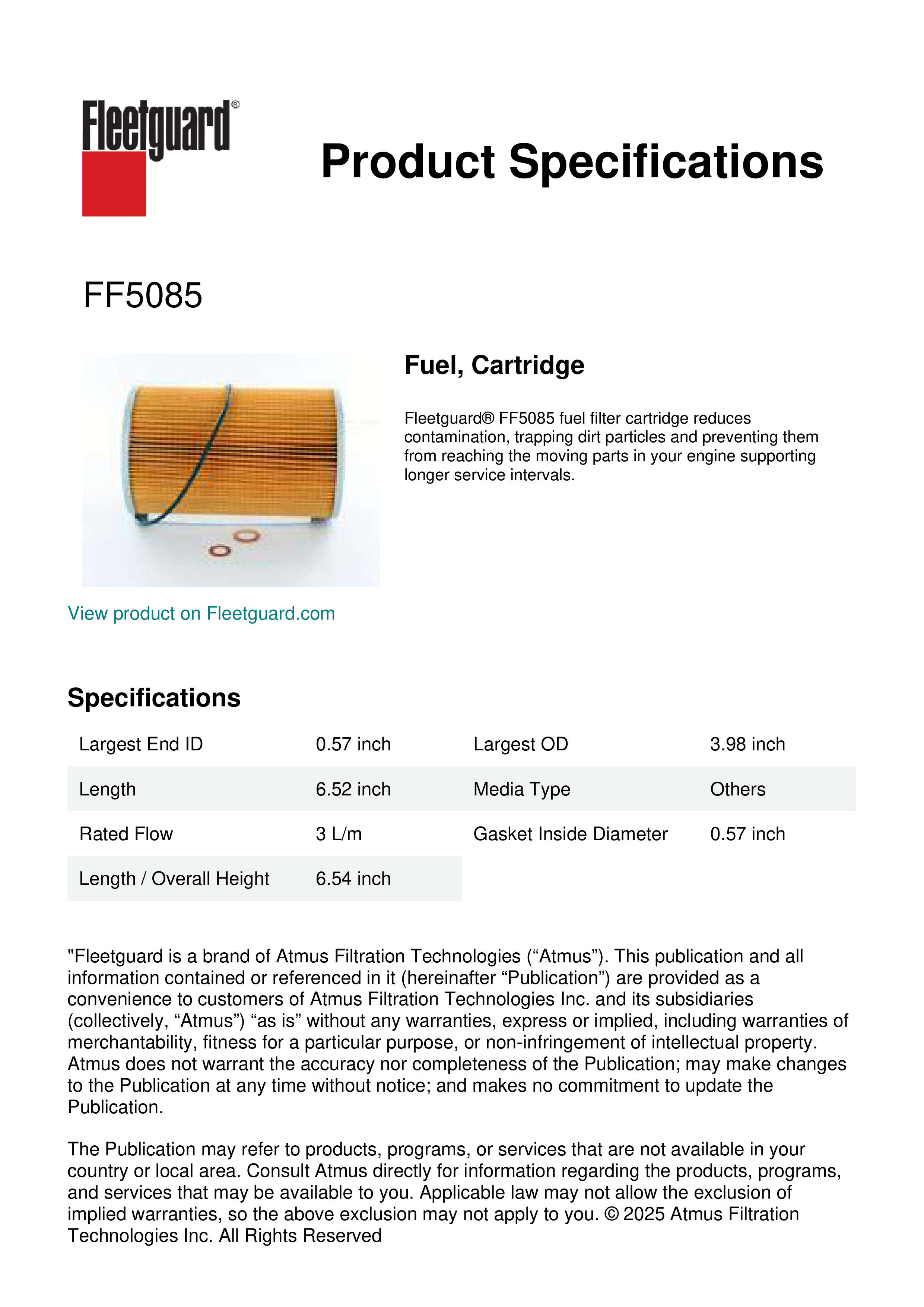 Fleetguard® FF5085 fuel filter cartridge reduces contamination, trapping dirt particles and preventing them from reaching the moving parts in your engine supporting longer service intervals.Specification